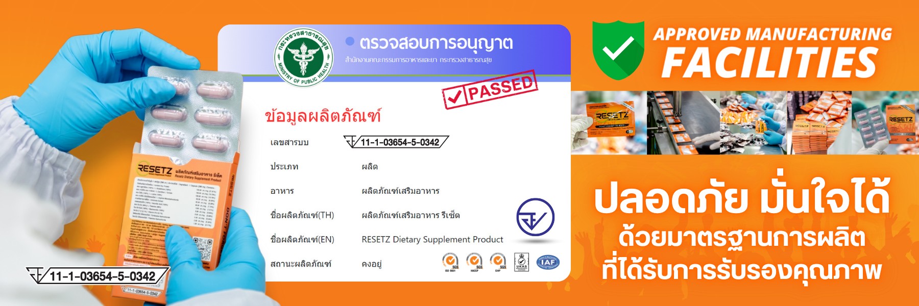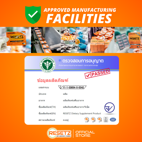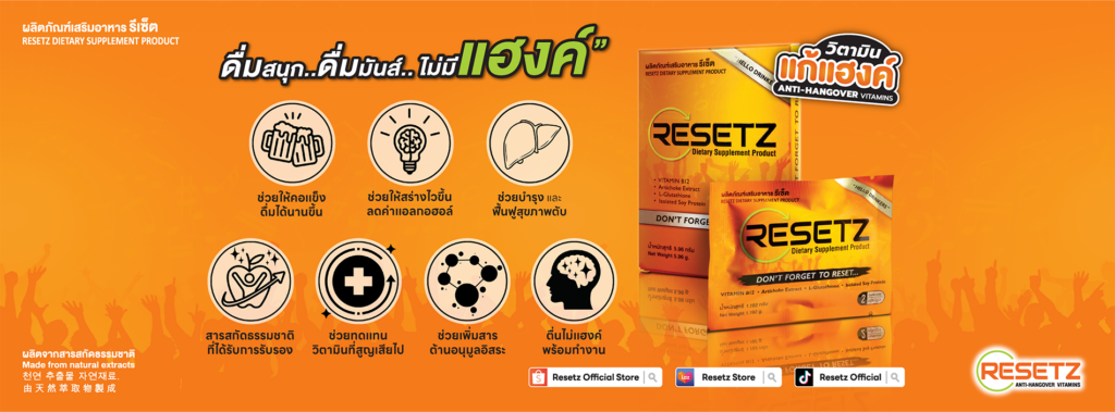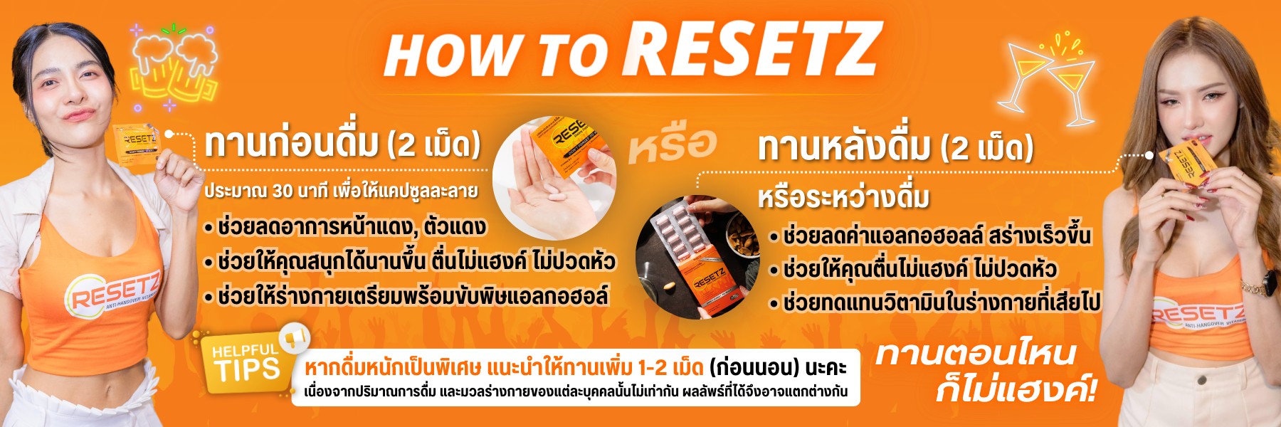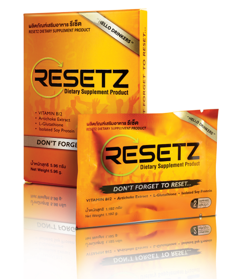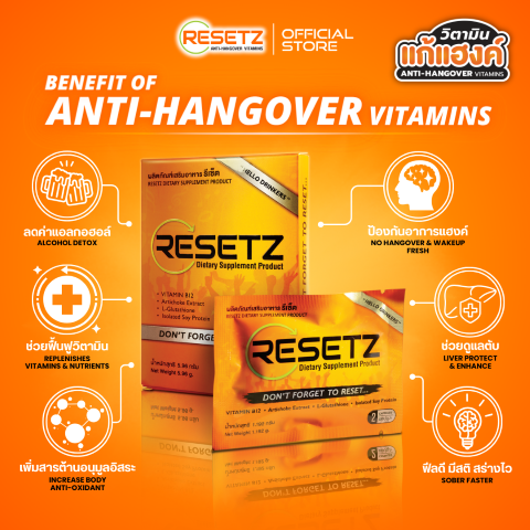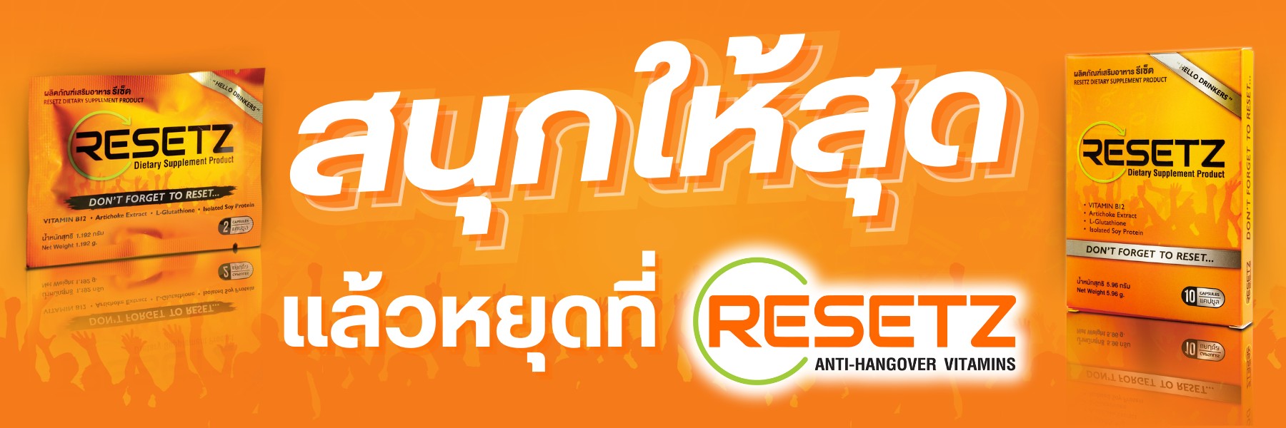 Resetz เป็นผลิตภัณฑ์เสริมอาหารที่สกัดจากธรรมชาติ ที่ประกอบไปด้วยสมุนไพรและวิตามิน มีประสิทธิภาพในการช่วยลดและป้องกันอาการแฮงค์และช่วยสกัดสารพิษแอลกอฮอลจากร่างกายได้เป็นอย่างดี และยังทดแทนวิตามินที่ร่างกายเสียไป
