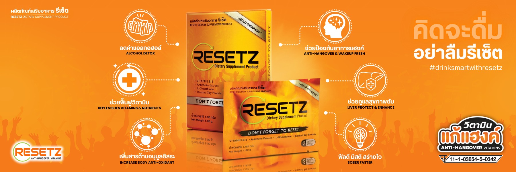 Resetz เป็นผลิตภัณฑ์เสริมอาหาร ที่สกัดจากธรรมชาติ ที่ประกอบไปด้วยสมุนไพรและวิตามิน มีประสิทธิภาพในการช่วยลดและป้องกันอาการแฮงค์และช่วยสกัดสารพิษแอลกอฮอลจากร่างกายได้เป็นอย่างดี และยังทดแทนวิตามินที่ร่างกายเสียไป